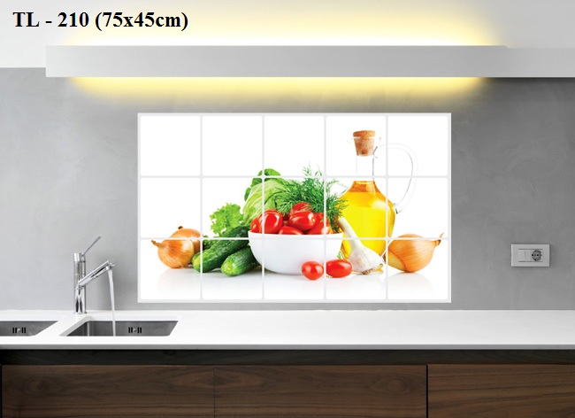Decal dán bếp Bình dầu ăn với hình ảnh Rau củ quả tươi xanh sẽ làm cho không gian bếp của bạn thêm sinh động, tươi vui