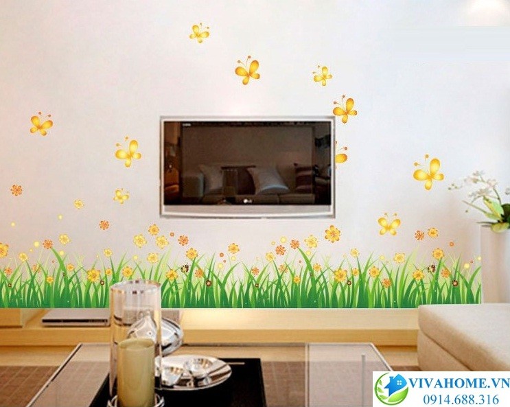 Decal dán chân tường Cỏ xanh hoa vàng với hình ảnh thảm cỏ xanh mát được điểm xuyết những bông hoa vàng rực rỡ, phía trên những chú bướm vàng tung tăng bay lượn sẽ làm căn phòng của bạn thêm tươi vui như có vườn hoa ngay trong nhà vậy