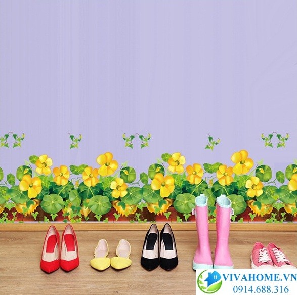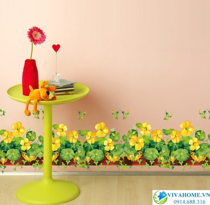 Decal dán chân tường Hoa bìm bìm vàng với hình ảnh giàn hoa bìm bìm bình dị, nhẹ nhàng cùng sắc hoa vàng tươi trên nền lá xanh mướt sẽ làm cho không gian căn phòng trở nên thanh bình nhưng cũng không kém phần sống động. Bạn còn có thể che đi những vết bẩn ở phần tường phía dưới, khe tiếp xúc giữa tường và sàn, tạo cảm giác sạch sẽ.