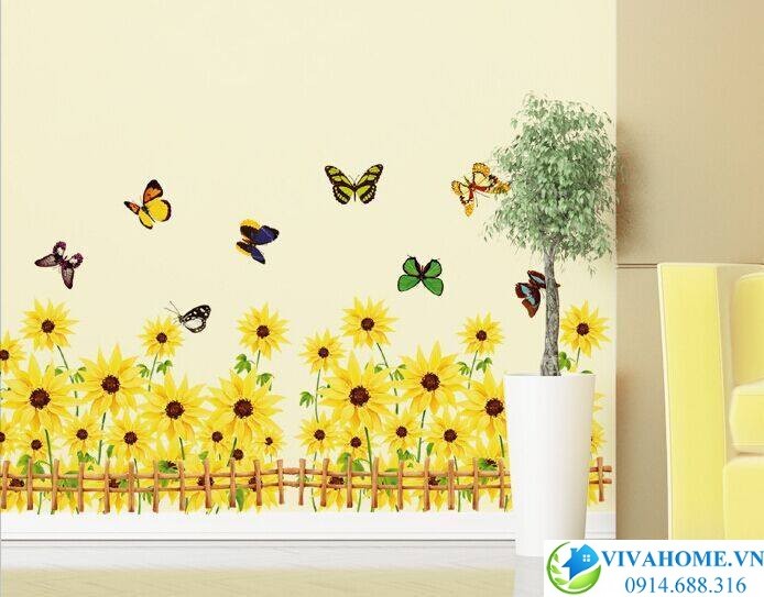 Decal dán chân tường Hoa hướng dương với hình ảnh những bông hoa hướng dương khoe sắc vàng rực rỡ trong vườn, cùng những chú bướm xinh xắn đang vui đùa phía trên sẽ làm cho căn phòng của bạn thêm sinh động, tươi vui. Bạn còn có thể che đi những vết bẩn ở phần tường phía dưới, khe tiếp xúc giữa tường và sàn, tạo cảm giác sạch sẽ.