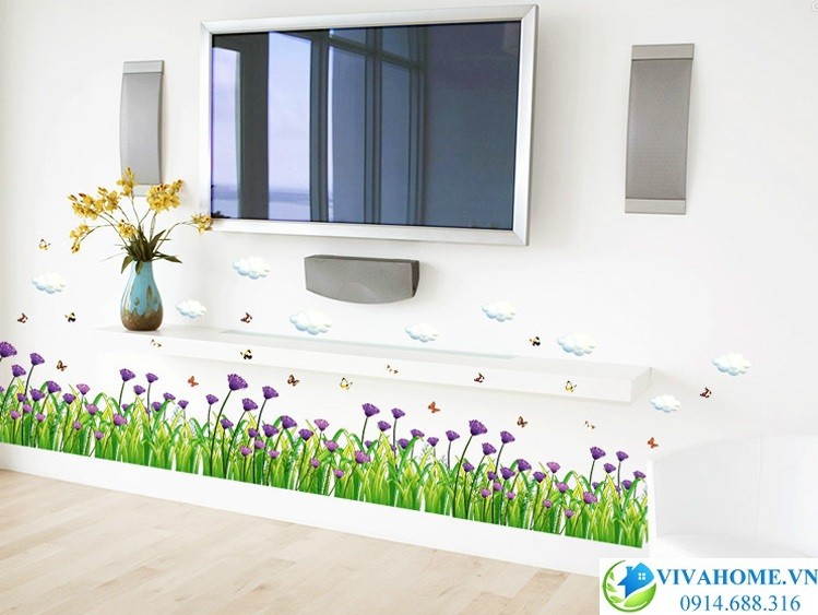 Với Decal dán chân tường hoa phăng tím, ngôi nhà của bạn như được bao quanh bởi thảo nguyên cỏ xanh mát cùng những bông hoa phăng tím nhẹ nhàng, những đám mây trắng lững lờ mơ mộng. Bạn còn có thể che đi những vết bẩn ở phần tường phía dưới, khe tiếp xúc giữa tường và sàn, tạo cảm giác sạch sẽ.