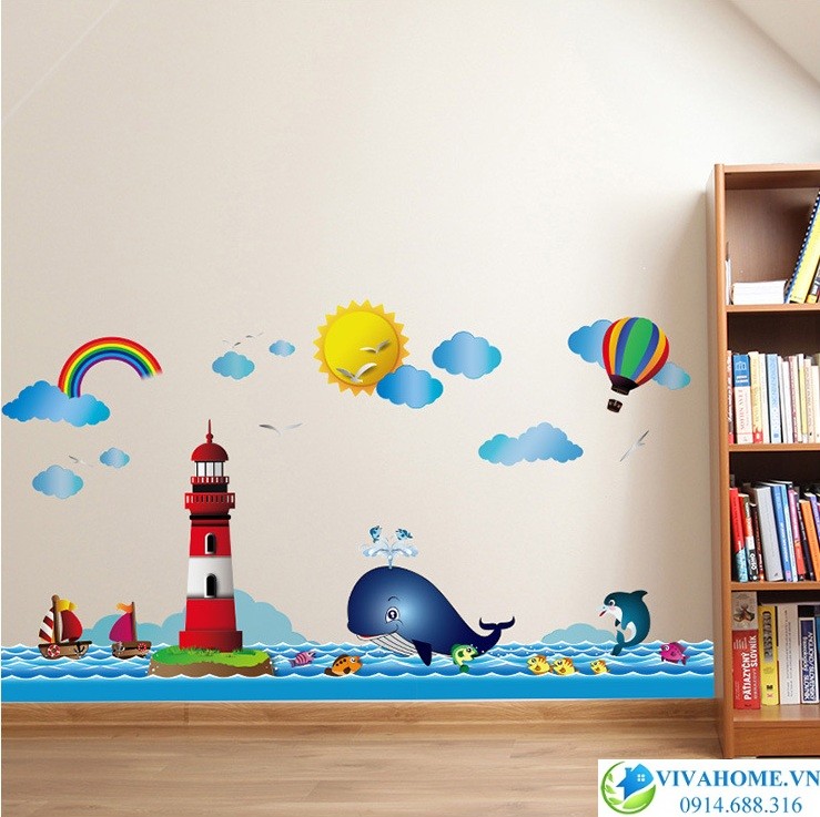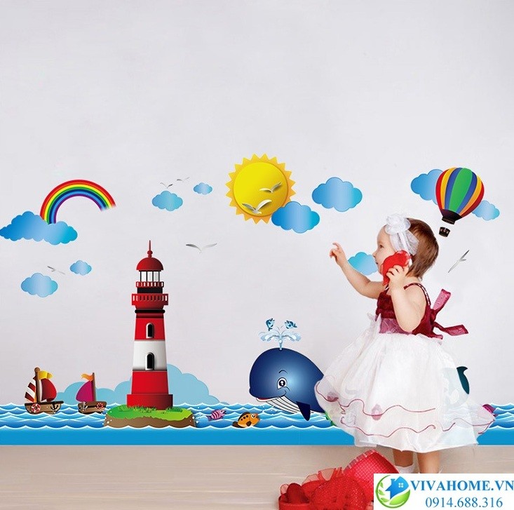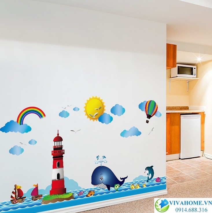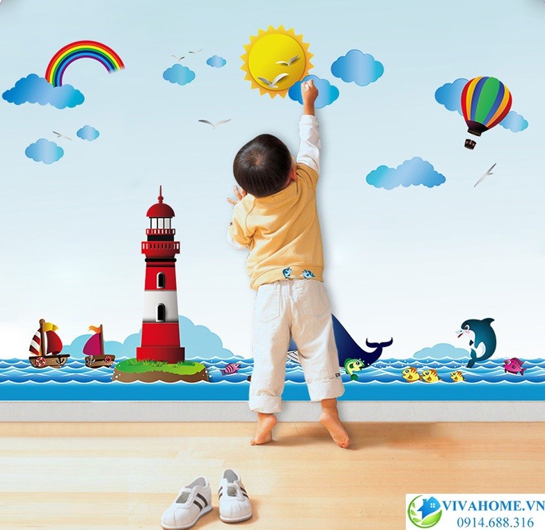 Decal dán chân tường Ngọn hải đăng với hình ảnh những chiếc thuyền du lịch nhiều màu sắc tham quan trên biển vào kỳ nghỉ mùa hè sẽ mang lại không khí vui tươi, thảnh thơi trong căn phòng của bạn.