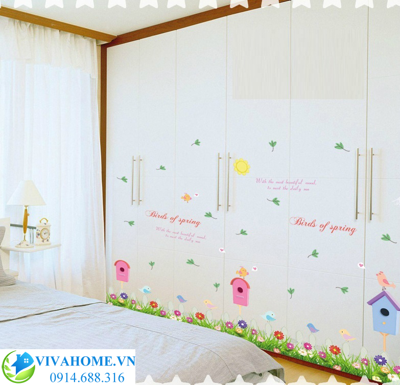 Decal dán chân tường Tổ chim non với sắc hoa cỏ dịu dàng xanh mát, hình ảnh tổ chim xanh, hồng với những chú chim non ríu rít hát ca báo hiệu mùa xuân về sẽ làm căn phòng của bạn thêm tươi vui, tràn ngập sắc xuân.