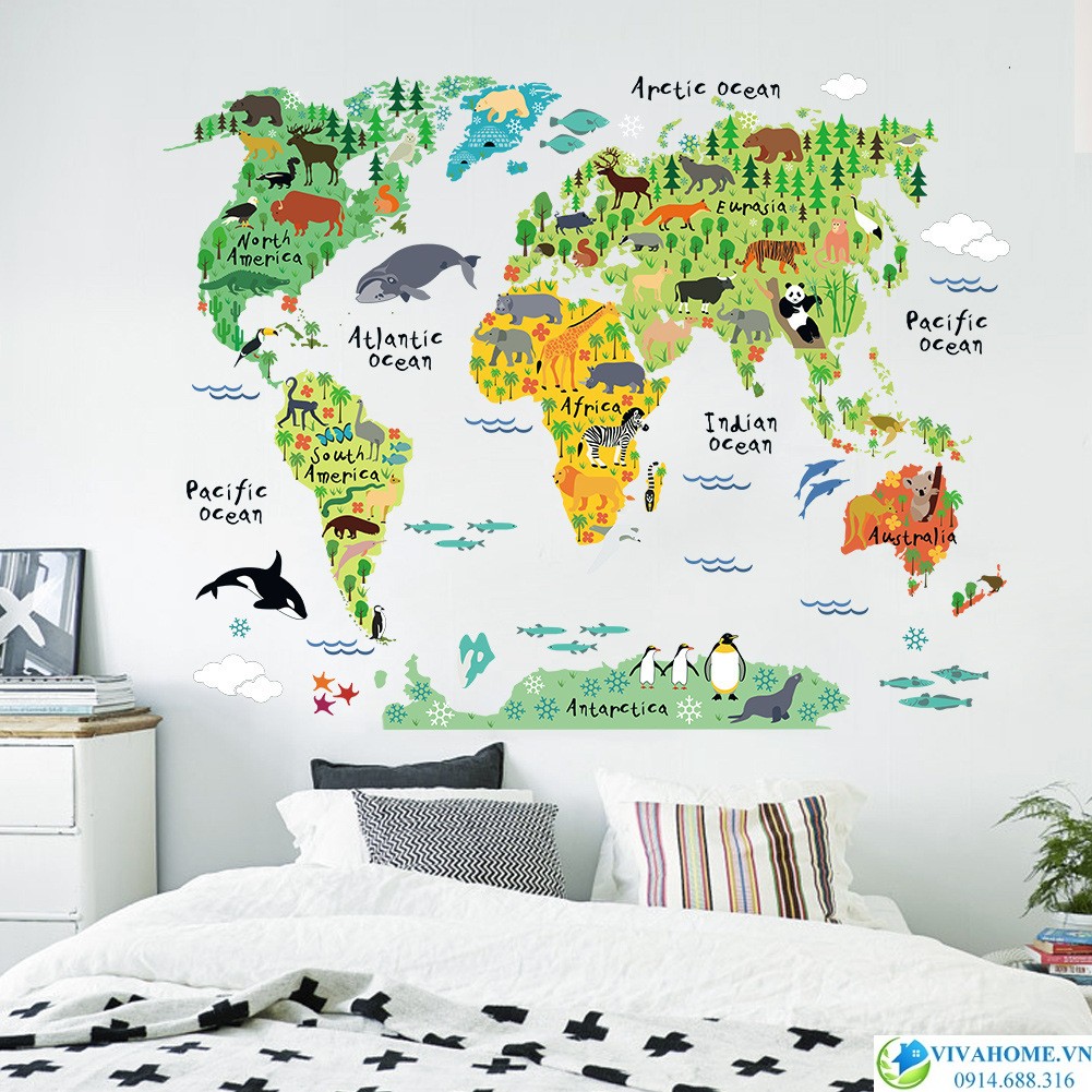 Decal dán tường Bản đồ thế giới thiên nhiên là tấm bản đồ được thiết kế cầu kì nhất với rất nhiều các con vật có hình ảnh khá chân thực mang lại vẻ đẹp độc đáo cho góc phòng riêng của bé. Bản đồ thế giới cho bé làm quen với những kiến thức cơ bản về địa lý như vị trí các nước, cờ các nước, các con vật và cây cối đặc trưng của từng vùng,...