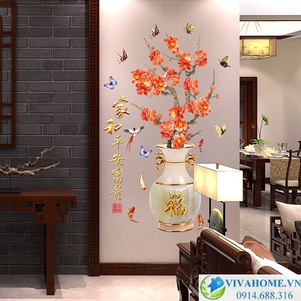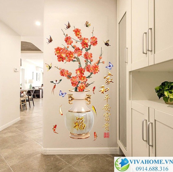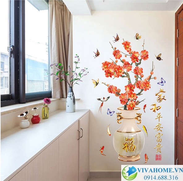 Decal dán tường Bình hoa đào đỏ là thiết kế mới và độc đáo nhất năm nay. Kích thước bình hoa lớn, cao 1m5 với những bông hoa to sắc đỏ rực rỡ sẽ đem lại may mắn cho gia đình bạn.