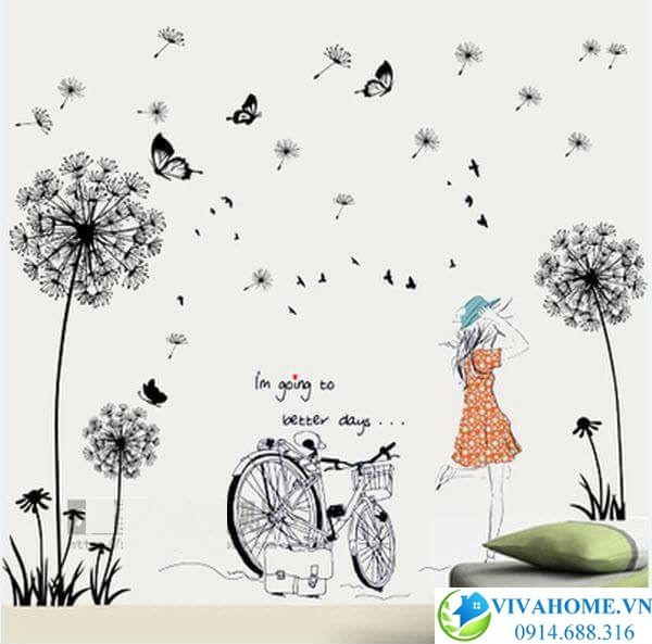 Decal dán tường bồ công anh và cô gái với hình ảnh hoa cỏ thiên nhiên được thiết kế cách điệu mang lại vẻ lãng mạn, khoáng đạt và độc đáo cho căn phòng của bạn.
