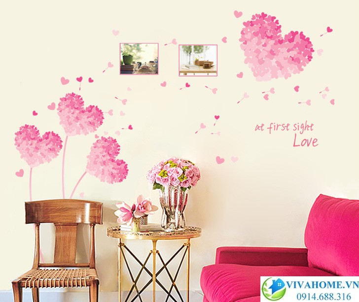 Decal dán tường Cẩm tú cầu trái tim hồng