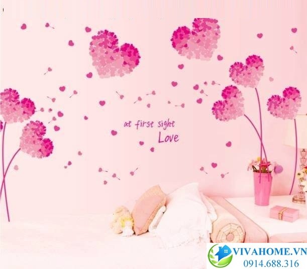Decal dán tường Cẩm tú cầu trái tim hồng bộ đôi