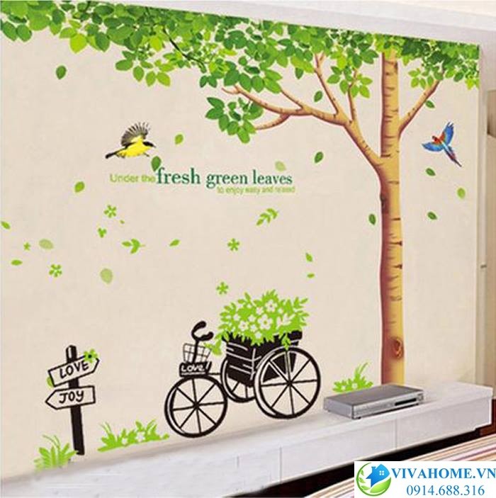 Decal dán tường Cây xanh và xe đạp chở hoa với hình ảnh thiên nhiên cây cối sinh động, tươi vui, mang cả không gian xanh mát vào ngôi nhà của bạn