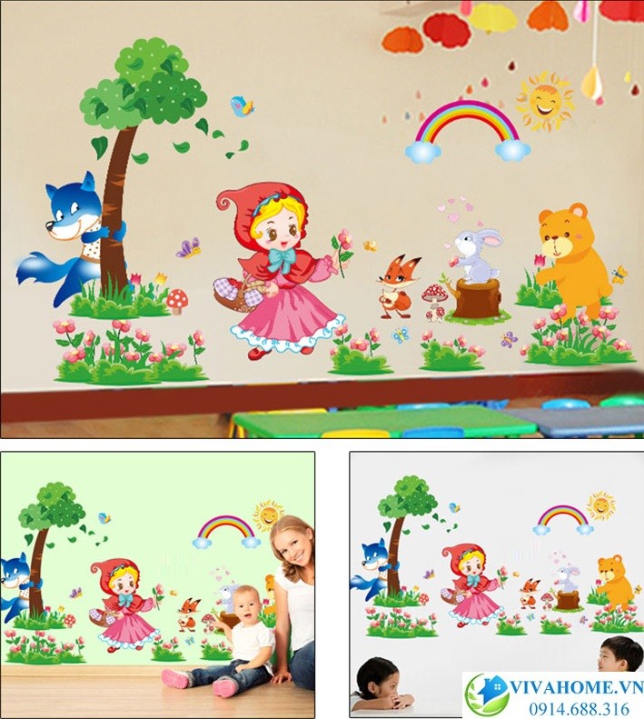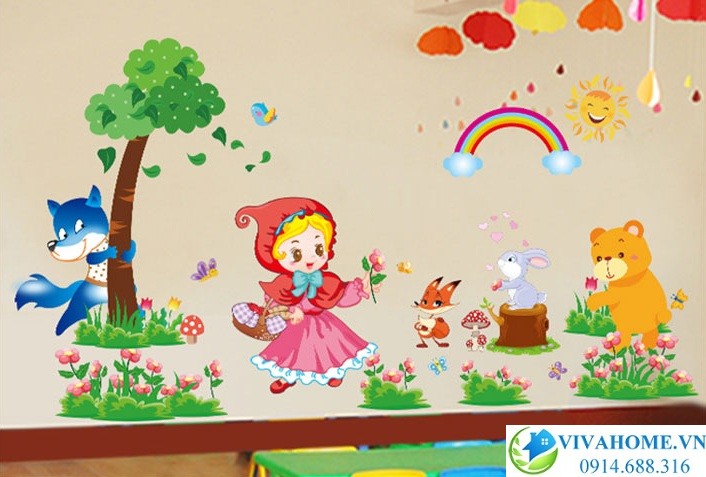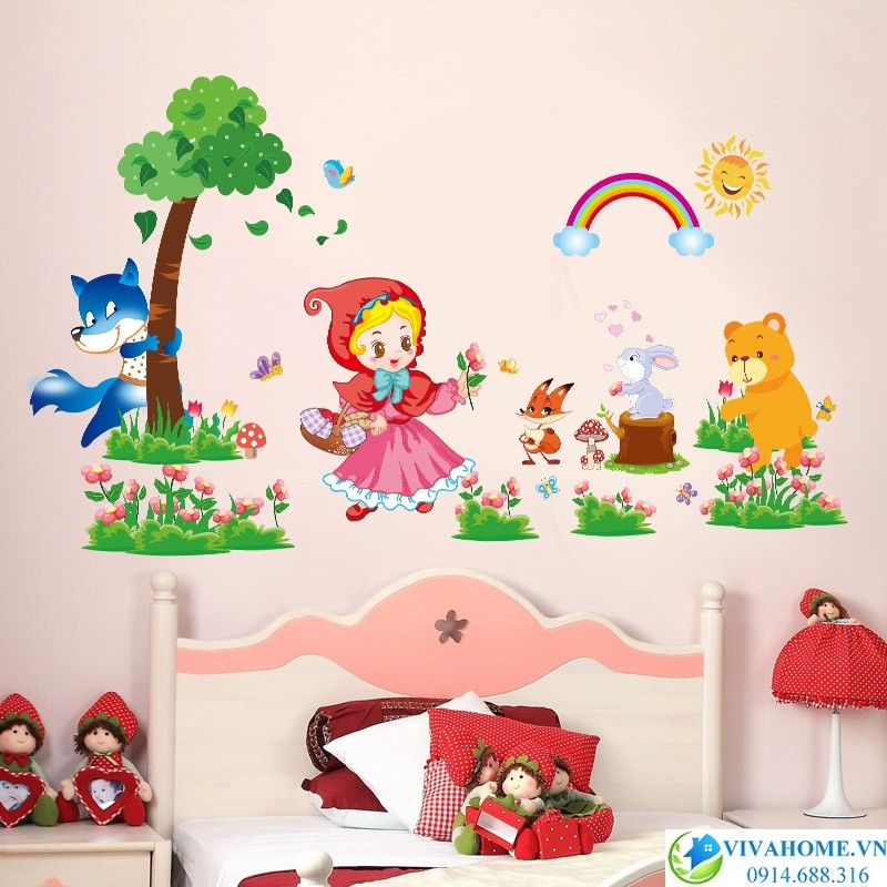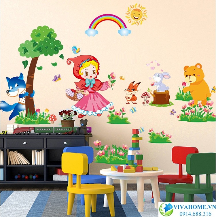 Decal dán tường Cô bé quàng khăn đỏ là một siêu phẩm xuất sắc trong chuỗi thiết kế sản phẩm dựa theo những câu chuyện cổ tích ý nghĩa. Bức tranh với màu sắc tươi vui tái hiện một câu chuyện cổ tích vô cùng sống động qua lăng kính trẻ thơ. Sản phẩm rất thích hợp dán phòng ngủ cho bé, khu vui chơi, lớp mầm non, tiểu học.