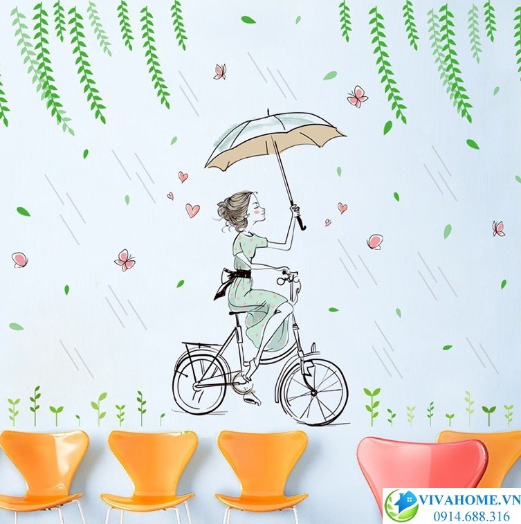 Decal dán tường Cô gái đạp xe dưới mưa với những họa tiết tươi vui, bắt mắt, cực kì kute giúp căn phòng thêm lãng mạn, cuốn hút, tạo điểm nhấn khác biệt