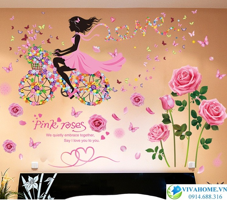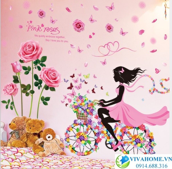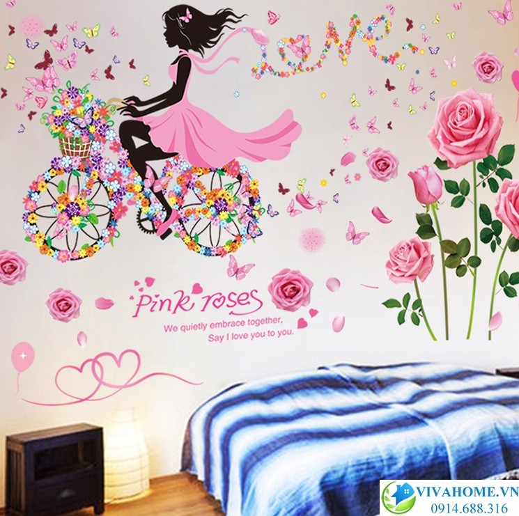 Decal dán tường Cô gái đạp xe hoa hồng với những họa tiết tươi vui, bắt mắt, cực kì kute giúp căn phòng thêm lãng mạn, cuốn hút, tạo điểm nhấn khác biệt