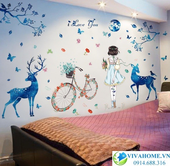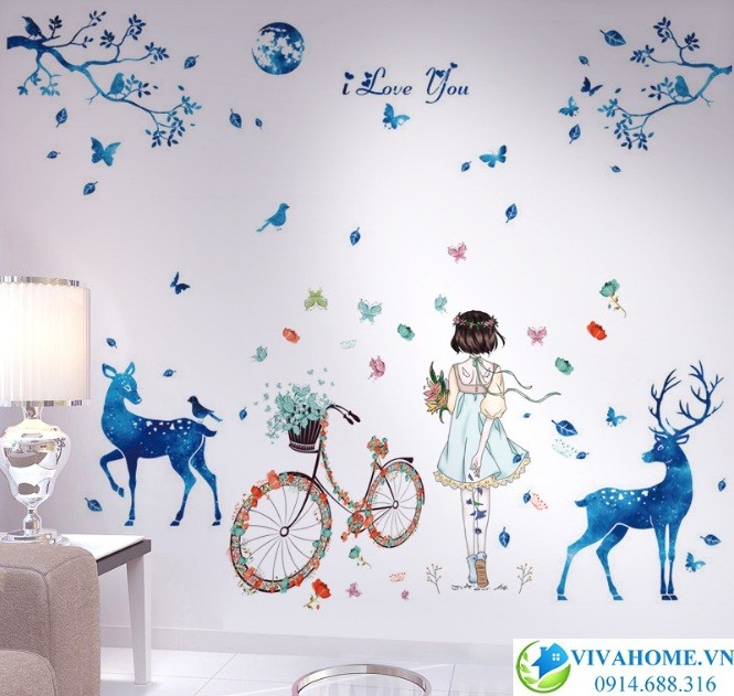 Decal dán tường Cô gái váy xanh với những họa tiết tươi vui, bắt mắt, màu sắc cổ tích, lãng mạn sẽ giúp căn phòng thêm cuốn hút, tạo điểm nhấn khác biệt