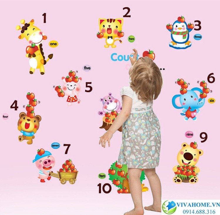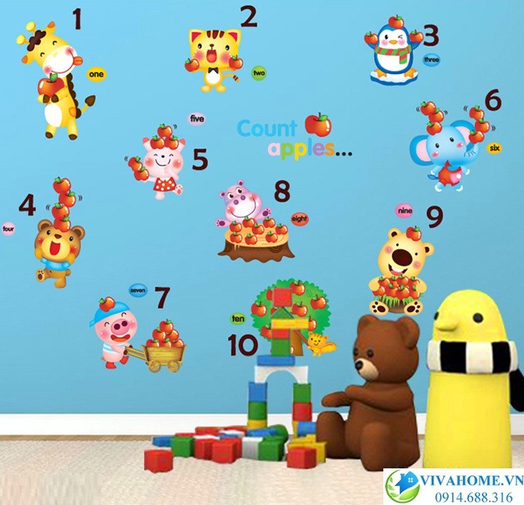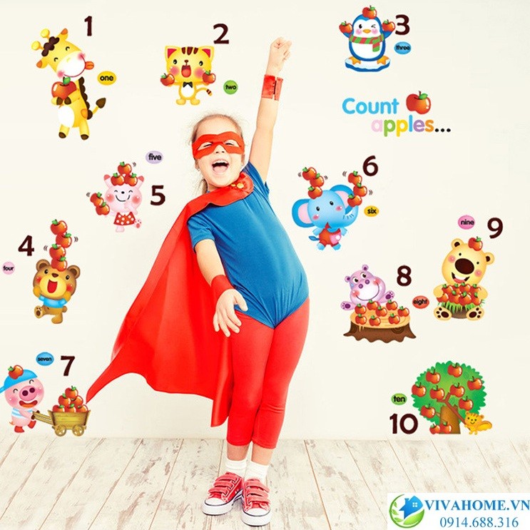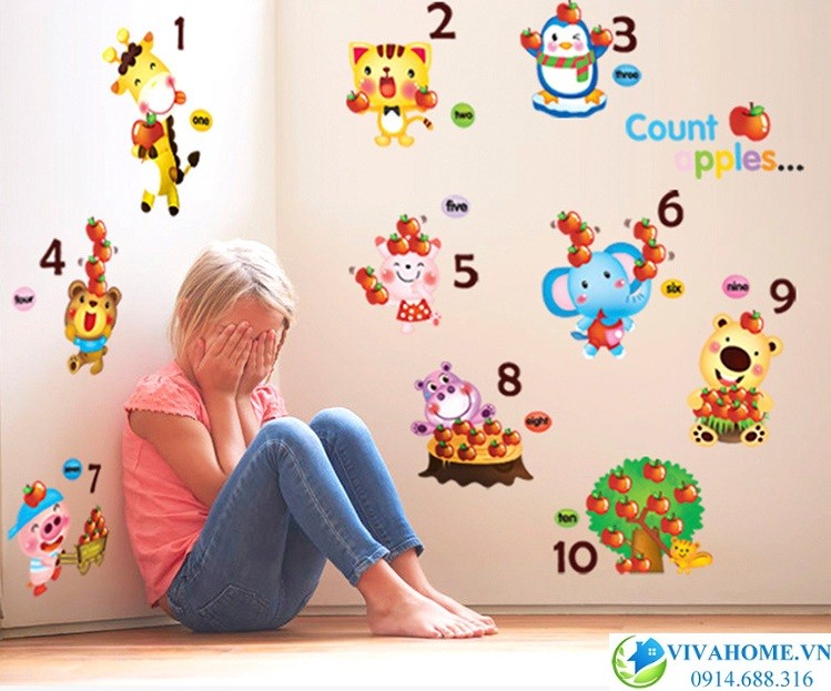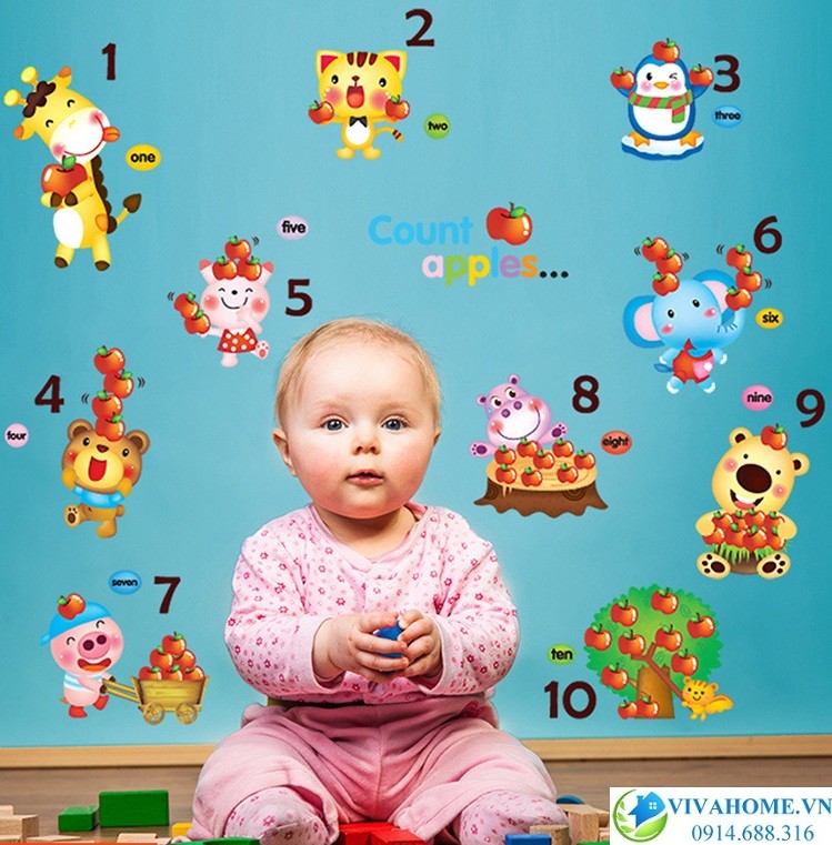 Decal dán tường Đếm hoa quả với những con thú ngộ nghĩnh, vui nhộn kết hợp với số và những trái táo tương ứng trên tay các con vật sẽ kích thích khả năng tìm tòi khám phá thế giới xung quanh của bé, giúp bé học hỏi và sáng tạo một cách tự nhiên nhất.