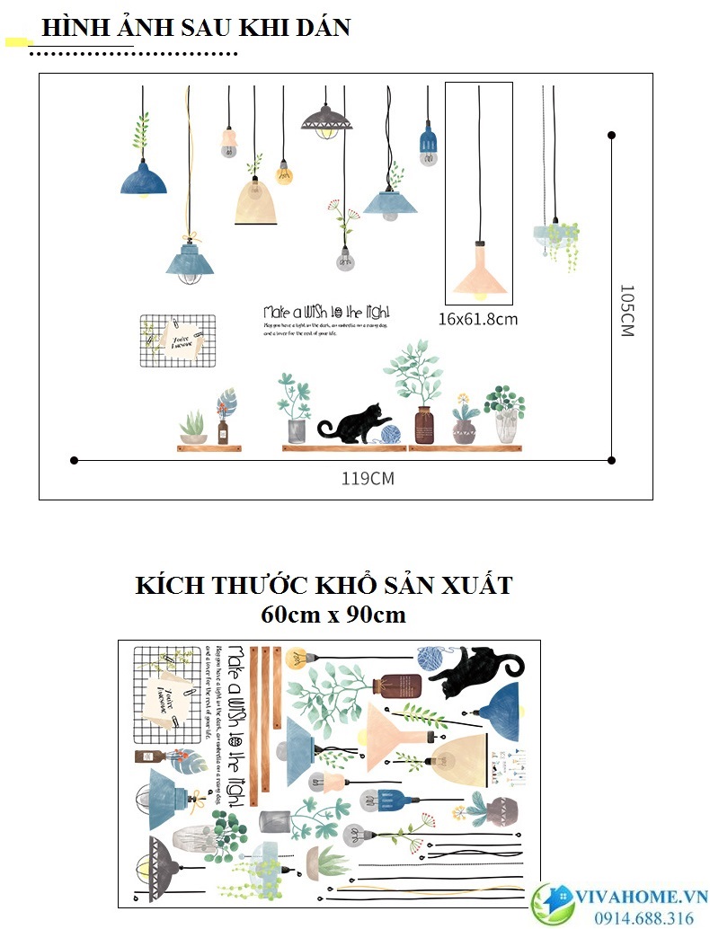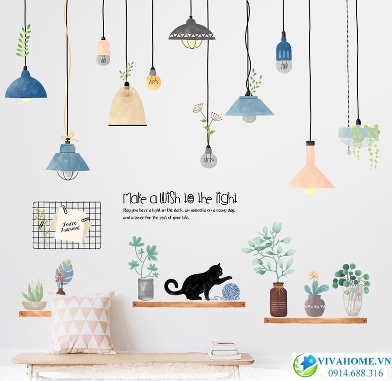 Decal dán tường Đèn và mèo nghịch cuộn len với hình ảnh những chiếc đèn trần xinh xắn với màu sắc rực rỡ được thiết kế cách điệu sẽ làm cho căn phòng của bạn thêm lãng mạn mà không kém phần cá tính