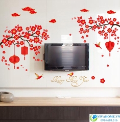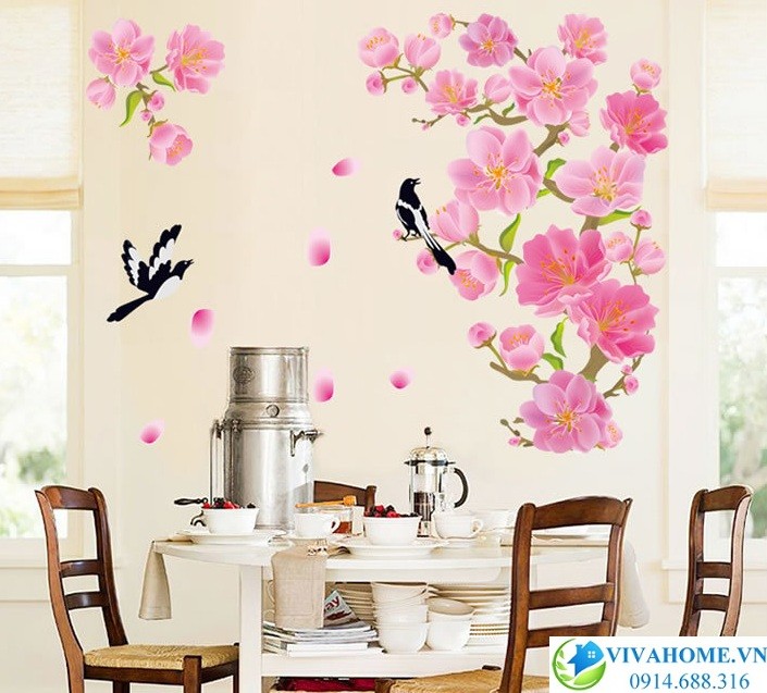 Decal dán tường hoa đào cánh to với các họa tiết tươi vui, màu sắc hài hòa giúp cho căn phòng thêm sống động, đáng yêu.