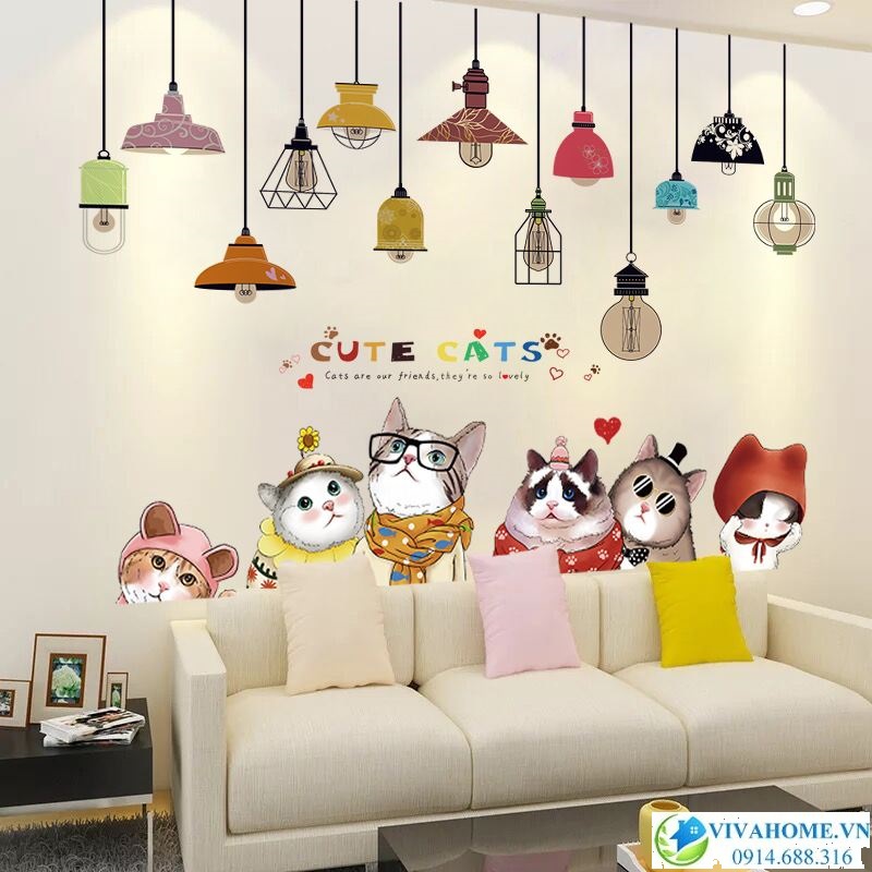 Decal dán tường Mèo và đèn sắc màu với những hình ảnh đáng yêu của những chú mèo sẽ đem lại vẻ đẹp lãng mạn nhưng không kém phần kute cho căn phòng