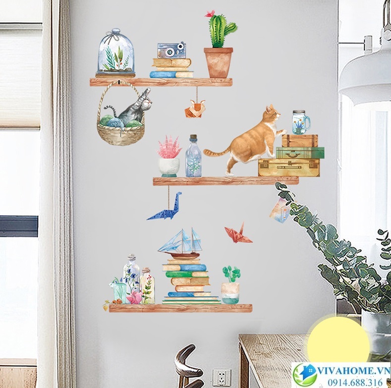 Decal dán tường Mèo và kệ sách với hình ảnh những chiếc kệ sách xinh xắn cùng chú mèo tinh nghịch với màu sắc rực rỡ được thiết kế cách điệu sẽ làm cho căn phòng của bạn thêm lãng mạn mà không kém phần cá tính