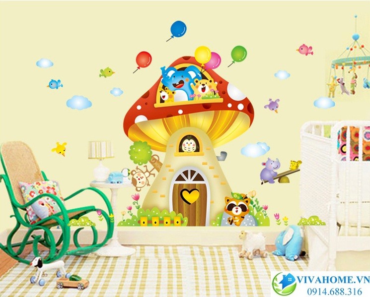 Decal dán tường Nấm khổng lồ với hình ảnh cây nấm rực rỡ màu sắc cùng những bạn nhỏ đang vui vẻ hát ca giúp không gian phòng ngủ của bé thêm tươi vui như lúc nào cũng có những người bạn bên cạnh.