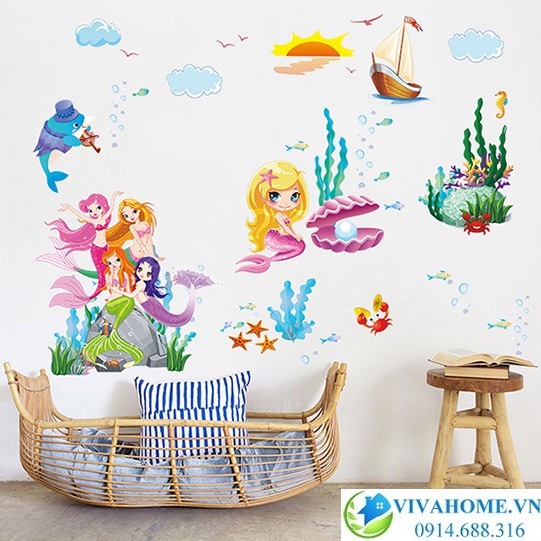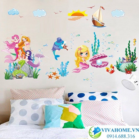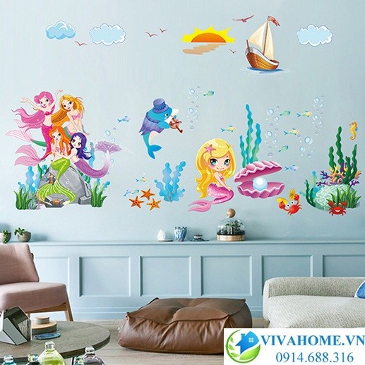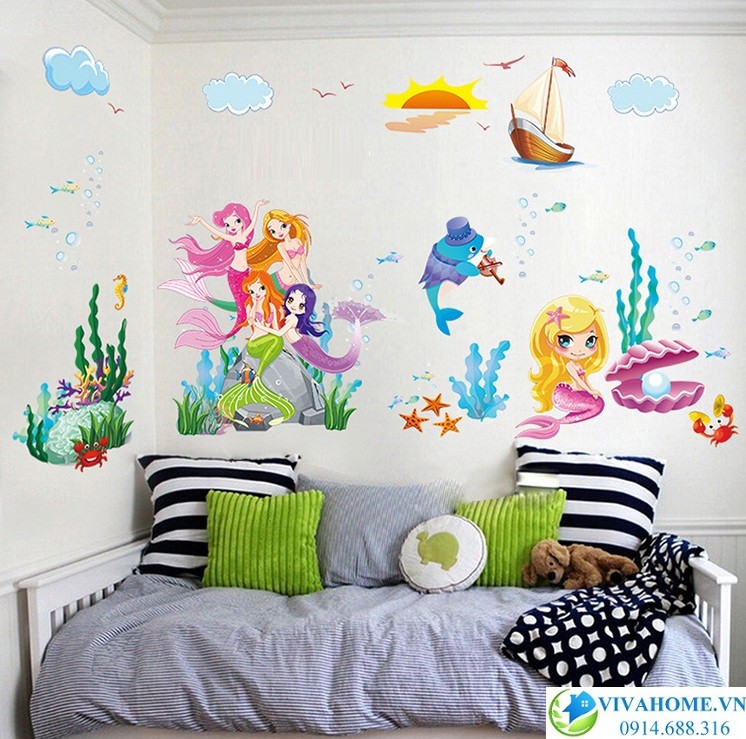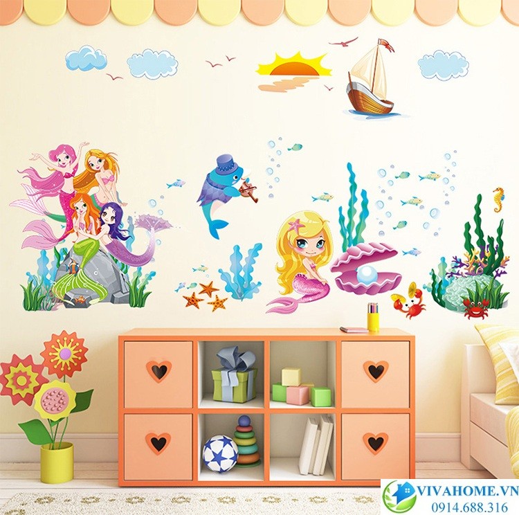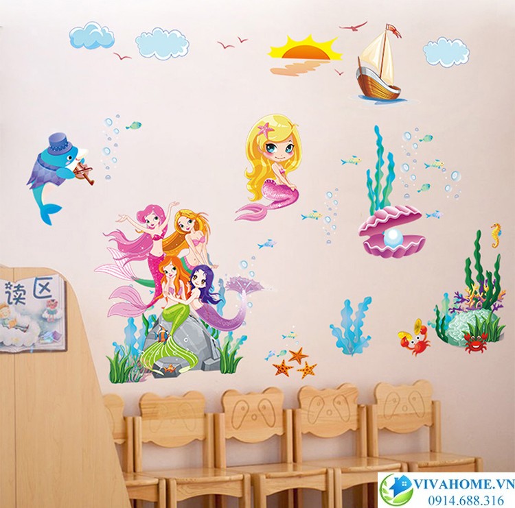 Decal dán tường Nàng tiên cá với những nhân vật hoạt hình nổi tiếng, thu hút và bắt mắt giúp không gian phòng ngủ của bé thêm tươi vui như lúc nào cũng có những người bạn bên cạnh. Sản phẩm rất thích hợp dán phòng ngủ cho bé, khu vui chơi, lớp mầm non, tiểu học.