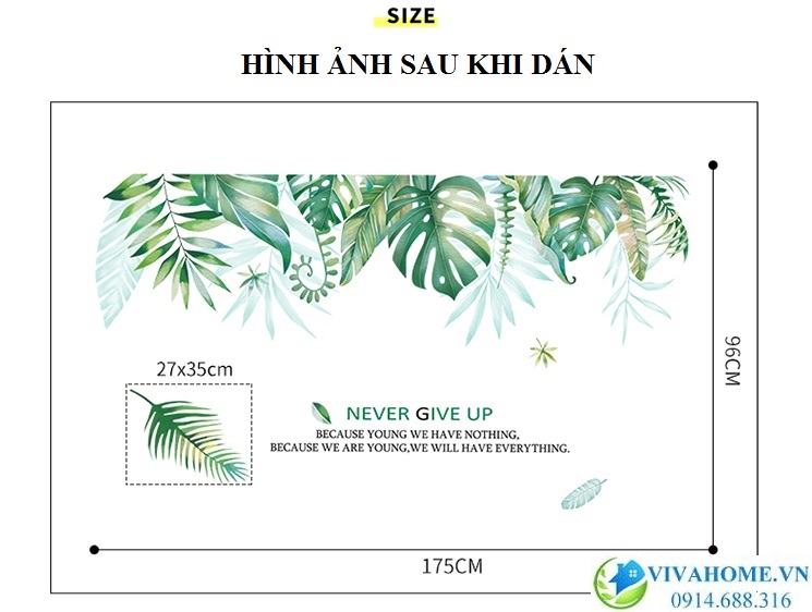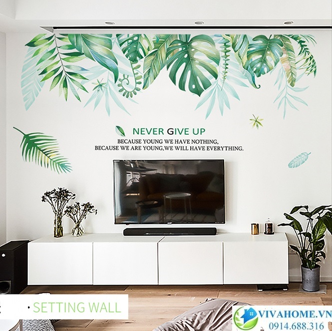 Decal dán tường Tán lá never give up với hình ảnh thiên nhiên cây cối sinh động, tươi vui, mang cả không gian xanh mát vào ngôi nhà của bạn