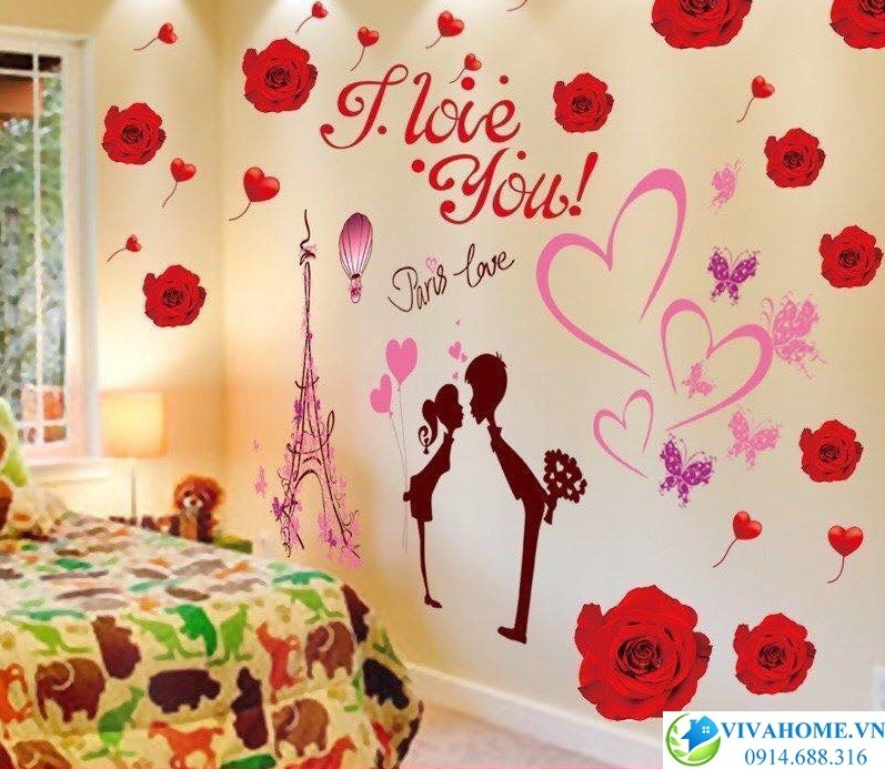 Decal dán tường Uyên ương hồng đỏ trái tim