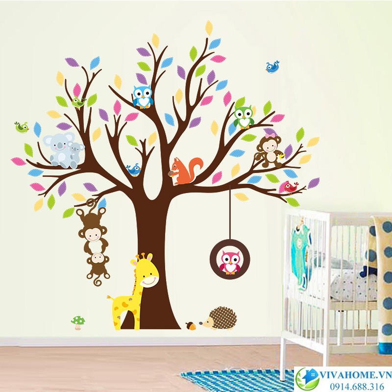 Decal dán tường Vườn thú zoo với hình ảnh cây lá nhiều màu sắc rực rỡ cùng những bạn thú nhỏ xinh xắn sẽ giúp căn phòng sẽ bớt khô khan, cứng nhắc, thay vào đó bé sẽ luôn cảm nhận được không gian tươi vui như có những người bạn nhỏ ngay trong phòng vậy.