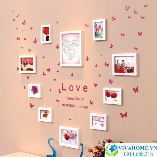 Khung ảnh treo tường trái tim mầu trắng kèm bướm hồng bao gồm: